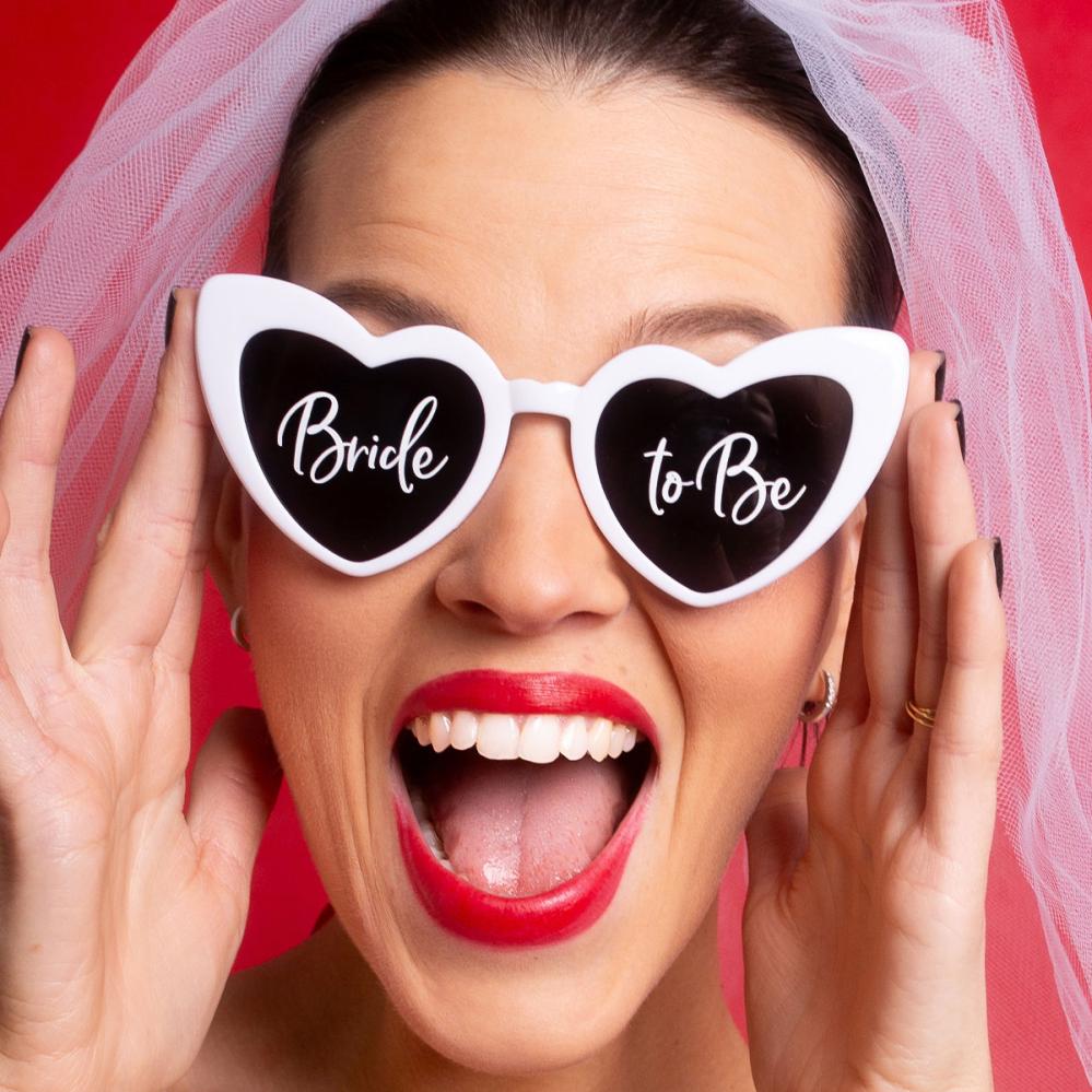 Bride to Be Hjärtformade Glasögon består av ett par vita, hjärtformade glasögon med mörktonade linser samt texten 'Bride' och 'to Be' i vitt på respektive lins. Observera att glasögonen ej är UV-skyddade!