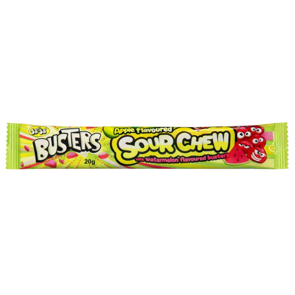 Busters Sour Chew Apple & Watermelon 20g är en tuggbar godisstång med syrlig smak av äpple, täckt av små vattenmelonsmakande Busters som ger en härlig kombination av sega och krispiga konsistenser.