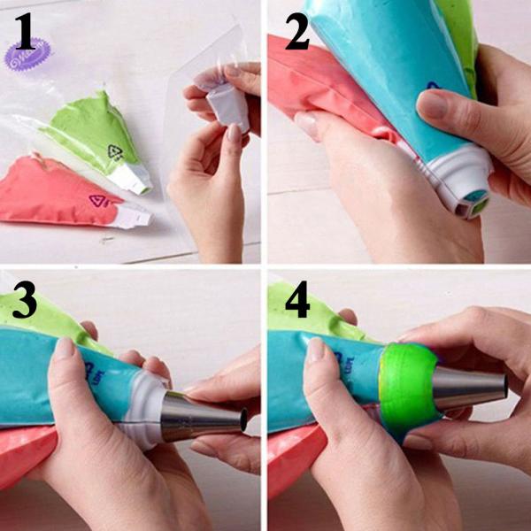ColorSwirl Spritsset innehåller tyll 1M och 1A, 6 stycken engångsspritspåsar(40 cm), 1 ColorSwirl tyllkoppling samt inspirerande spritsdesigns. Fyll tre spritspåsar med valfritt innehåll, kombinera sedan de med medföljande trevägs-tyllkopppling för att skapa en multifärgad design.