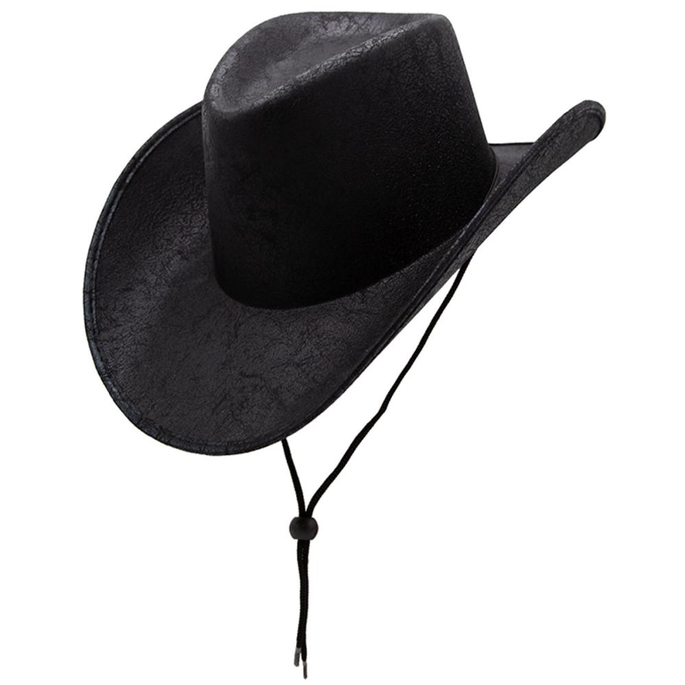Sätt stilen på nästa cowboy- eller westerntemafest med en svart cowboyhatt i åldrat konstläder. Hatten är perfekt till en cowboyutklädnad och ger din look en autentisk känsla med snöre under hakan.
