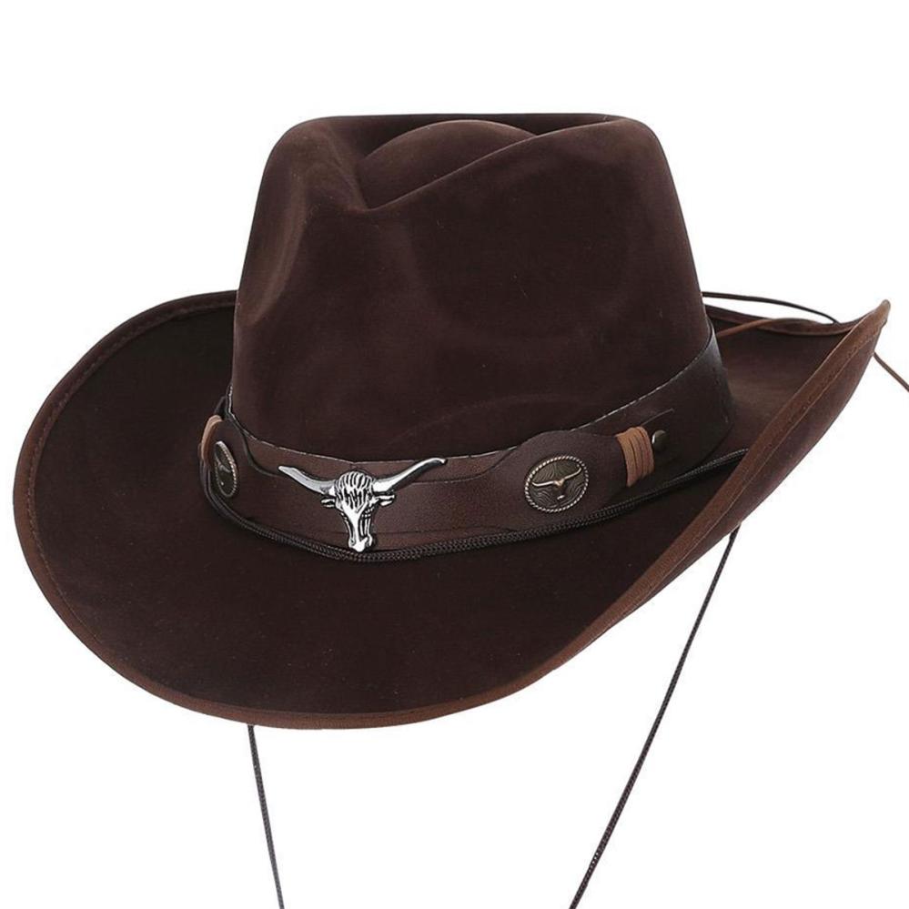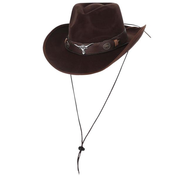 Cowboyhatt Brun Konstläder Western omfattar en brun cowboyhatt i ett läderliknande material, ett brunt band med metalldetaljer i form av tjur symboler och ett snöre knutet i en rosett baktill samt ett snöre man kan dra åt runt halsen.