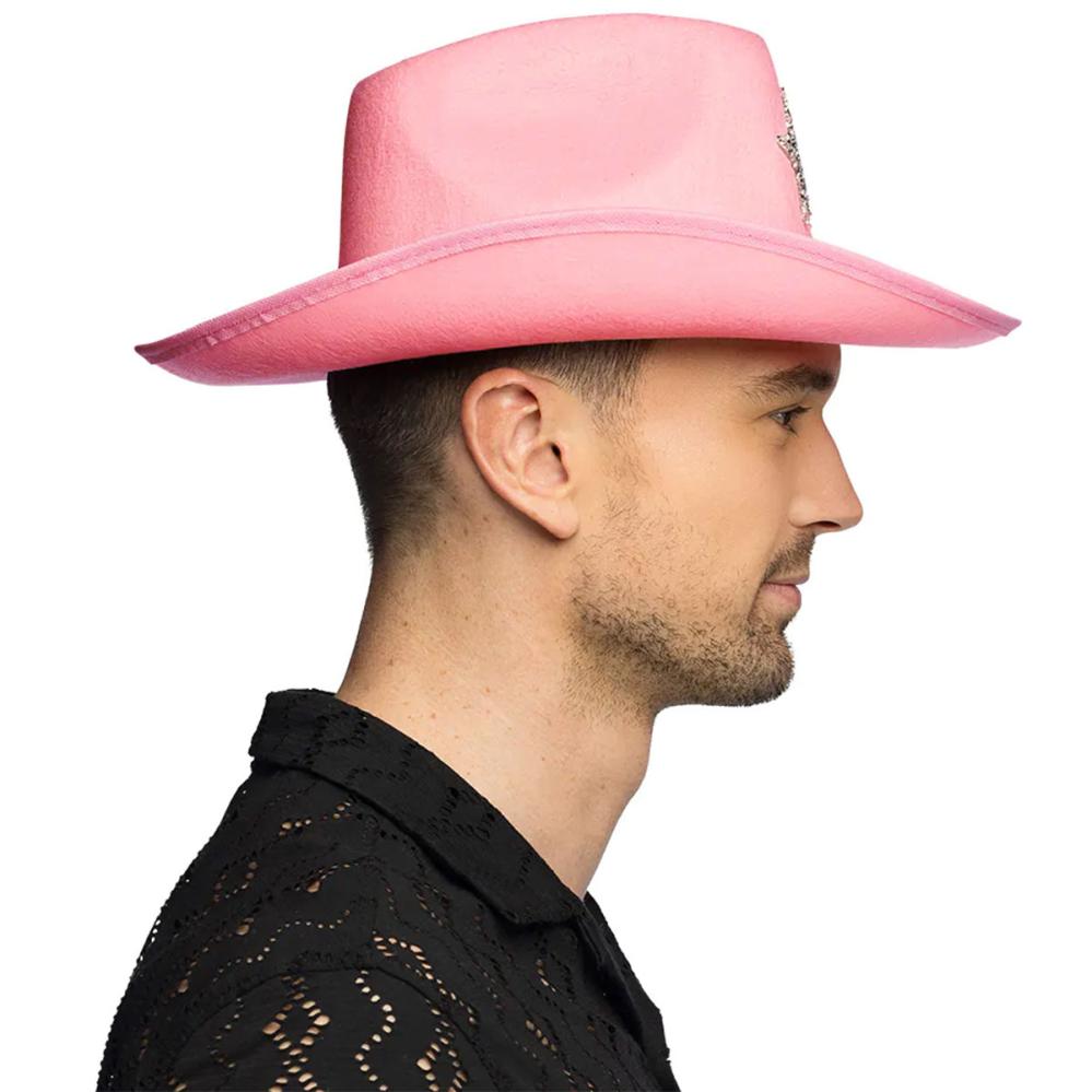 Cowboyhatt med Stjärna Ljusrosa omfattar en ljusrosa cowboyhatt dekorerad med silverfärgade strass som formar ett band runtom och en stjärna framtill.