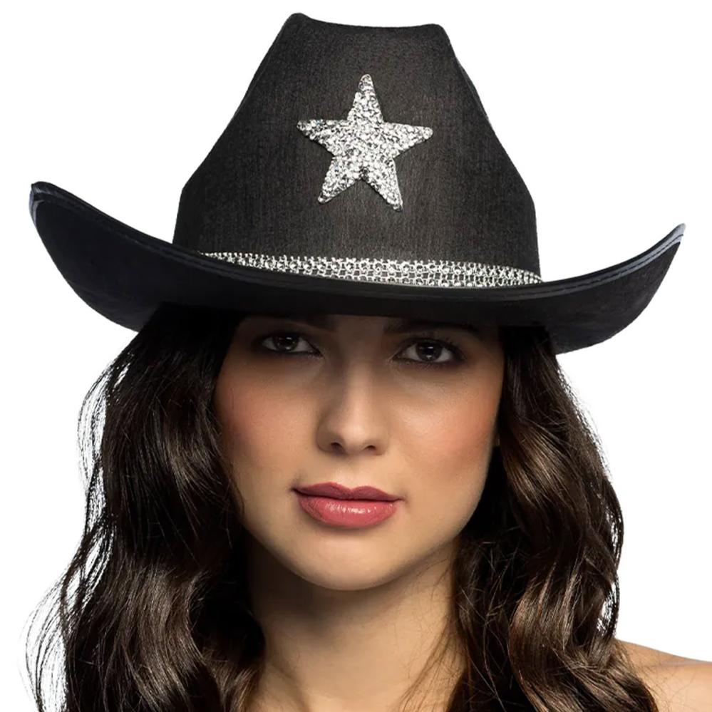 Cowboyhatt med Stjärna Svart omfattar en svart cowboyhatt dekorerad med silverfärgade strass som formar ett band runtom och en stjärna framtill.