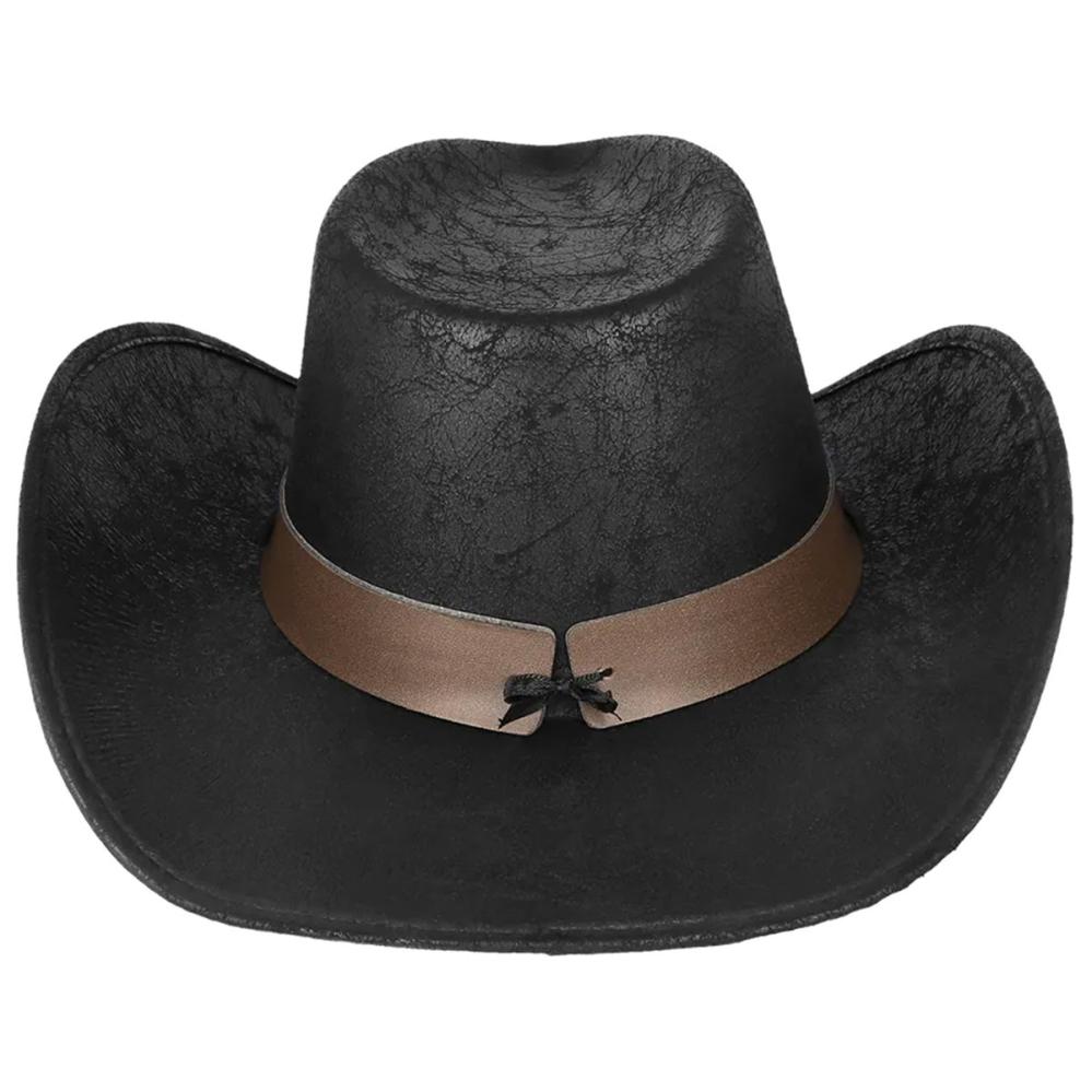 Cowboyhatt Tjurhuvud Svart är en svart cowboyhatt med ett brunt band i konstläder runtom, dekorerad med ett silverfärgat tjurhuvud och två guldfärgade medaljonger med tjurhuvud. Hatten hålls på plats med ett justerbart svart snöre under hakan.