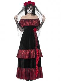 Day of the Dead Topphatt Mini består av en söt liten hatt i svart sammets-tyg. Hattens kant pryds av tre små rosor i svart och rött, samt en svart liten slöja som är avtagbar. Hatten hålls på plats med ett svart diadem.