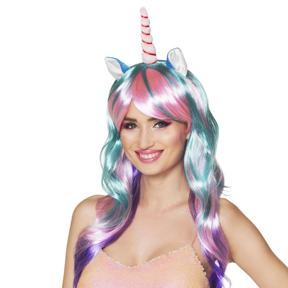 Klä ut dig till en cool enhörning med denna fantastiska peruk med enhörningshorn, öron och vackra pastell färger! Perfekt peruk för dig som ska på unicorn tema fest och kalas, ett måste för alla party sugna enhörningar. Med denna peruk i blått, rosa och lila blir du nästan lika magisk som en riktig enhörning, så gör dig redo för ett himmelskt kalas.