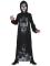 Demon Dräkt med Spökansikte Barn omfattar en lång svart dräkt med luva och ett skelettansikte på framsidan och rök som stiger upp vid fötterna.