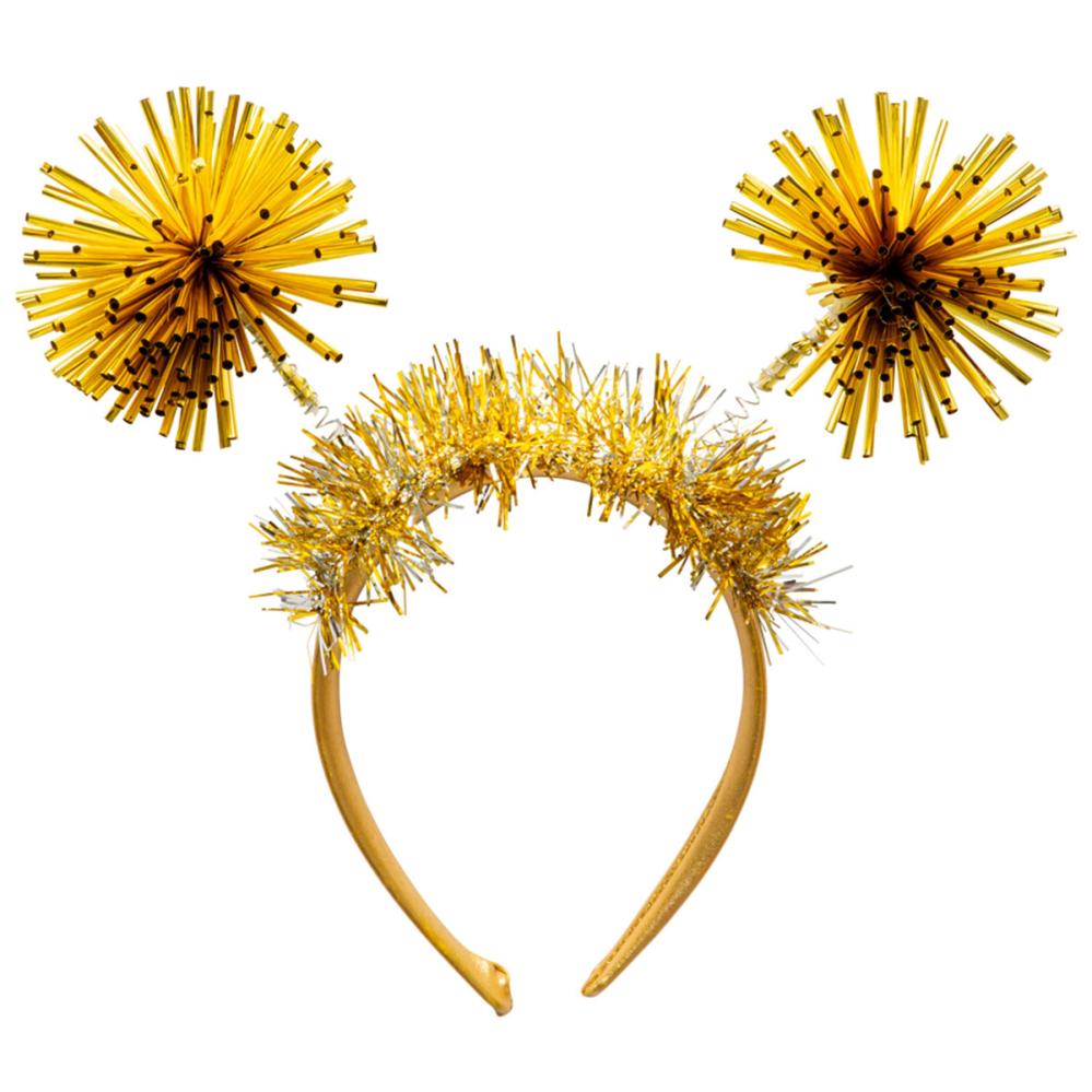 Diadem med Pom Poms Guld omfattar ett guldfärgat diadem med två utstickande pom poms.