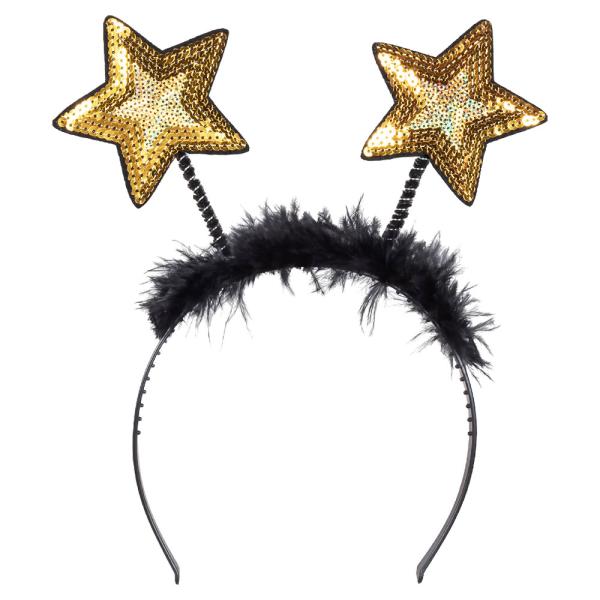 Diadem med Stjärnor Guld omfattar ett svart diadem med fluffiga fjädrar samt två st uppstickande stjärnor med guldiga paljetter. Diademet är tillverkat av äkta fjädrar och plast. Passar både vuxna och barn.