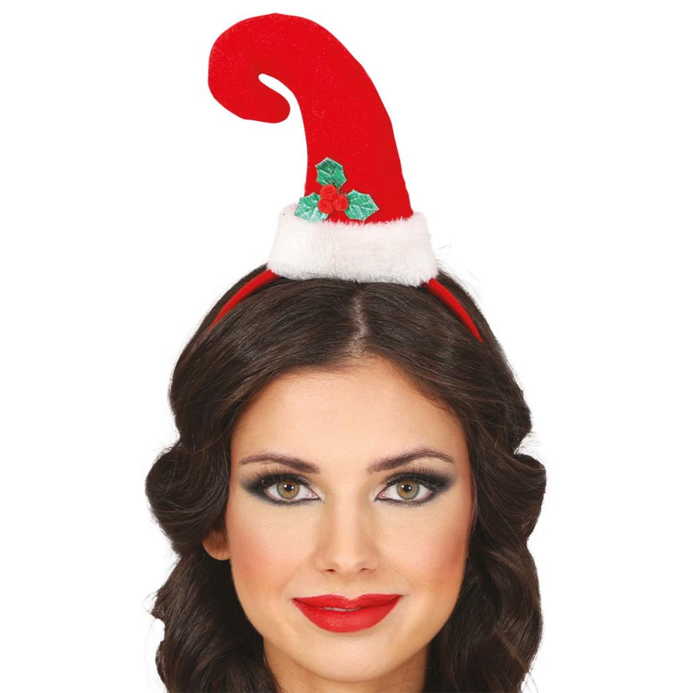 Diadem med Tomteluva omfattar ett rött, tygklätt diadem med en liten röd-vit tomteluva på toppen, dekorerad med en julmistel på framsidan.