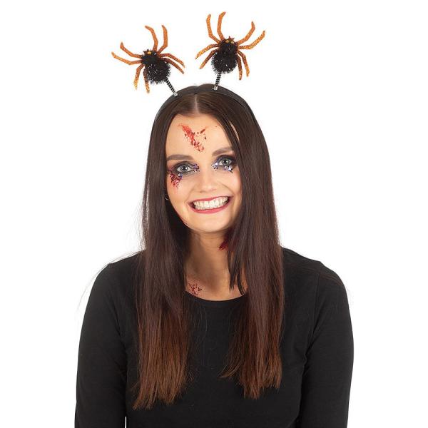 Diadem Spindlar omfattar ett diadem med två stycken svarta spindlar med ben i orange.