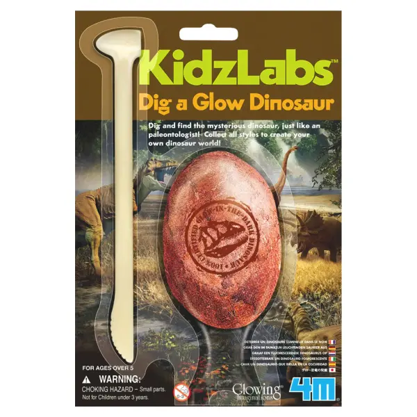 Dig a Glow Dinosaur Utgrävningsset omfattar ett verktyg och en sandklump innehållandes en självlysande dinosaurie som behöver grävas ut försiktigt. Det finns 6 olika dinosaurier som kan gömma sig i klumpen.