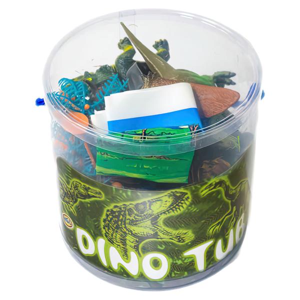 Dinosaurieleksaker i Burk omfattar ett leksaksset i 12 delar som består av dinosaurier, träd, stenar, en vulkan samt en plastbild med motiv av ett dinosaurielandskap. Leksakerna är tillverkade av plast och kommer i en smidig burk.