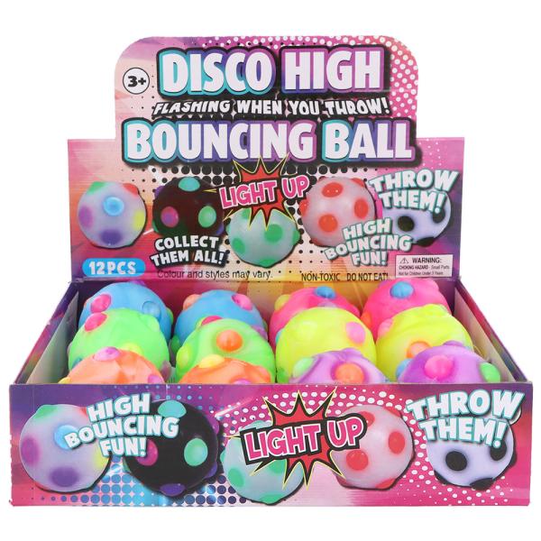 Discoboll Pop It med LED omfattar en färgglad stressboll med 'Pop It' knappar i olika färger samt LED som blinkar när du kastar den. Bollen finns i färgerna orange, blå, rosa, lila, grön och gul, men de säljs osorterade och styckvis så det blir en överraskning vilken färg du får.