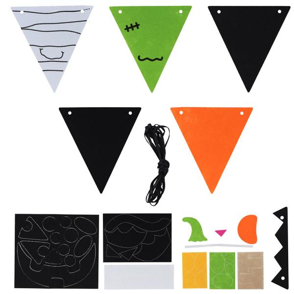 Sätt ihop din egen festliga vimpelgirlang med halloweenmotiv. Denna halloween girlang är perfekt för pyssel och skapar en skräckinjagande atmosfär med fem unika vimplar. Enkelt, roligt och personligt.