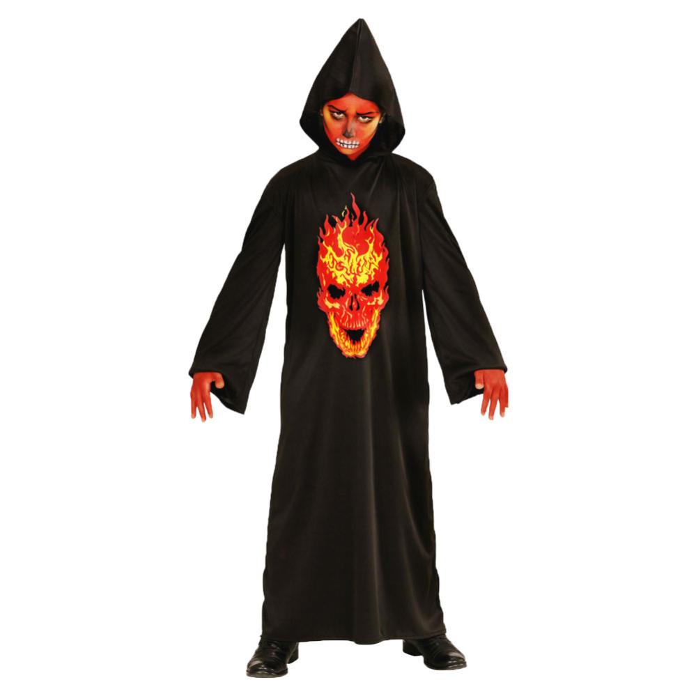 Djävul Dräkt Barn omfattar en svart helkroppsdräkt med huva och brinnande dödskallemotiv framtill. Dräkten är i polyester och passar barn.