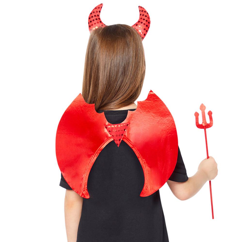 Förvandla barnets look med detta djävulskit som är ett perfekt tillbehör för en Halloweenmaskerad som djävul. Setet ger en glansig finish och dessa maskeradkläder passar utmärkt som utklädnad till djävul för barn.