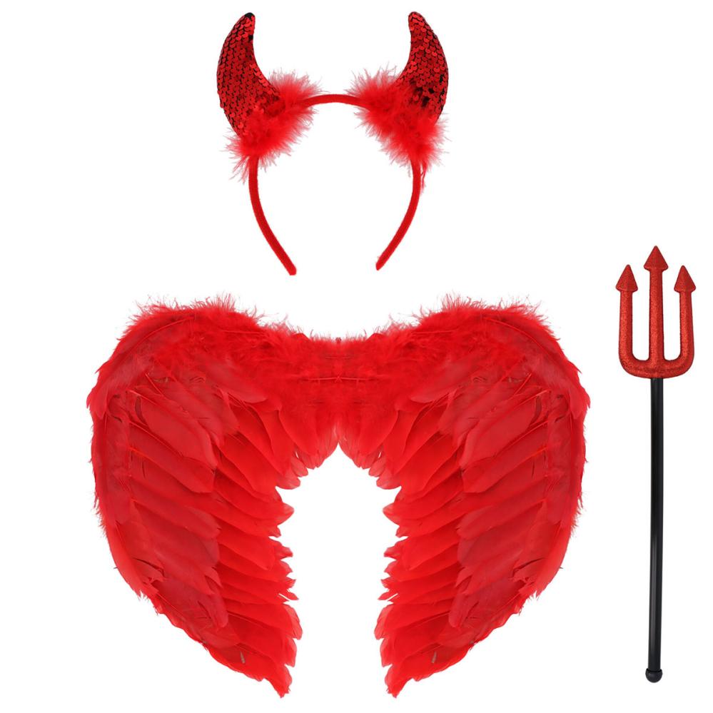 Djävulskit omfattar ett rött set som innehåller befjädrade röda vingar med röda elastiska band som bärs över axlarna, ett rött tygbeklätt diadem med röda djävulshorn dekorerade med paljetter på ena sidan, samt en kort treudd som har ett svart skaft.