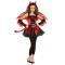 Djävulsklänning med Vingar Barn omfattar en röd/svart klänning med en svart kjol gjord med ett yttre lager av svart nättyg med skimrande röda flammor, en fastsatt röd svans, röd/svarta vingar, ett diadem med röda horn och armvärmare med röda flammor samt svart leggings.