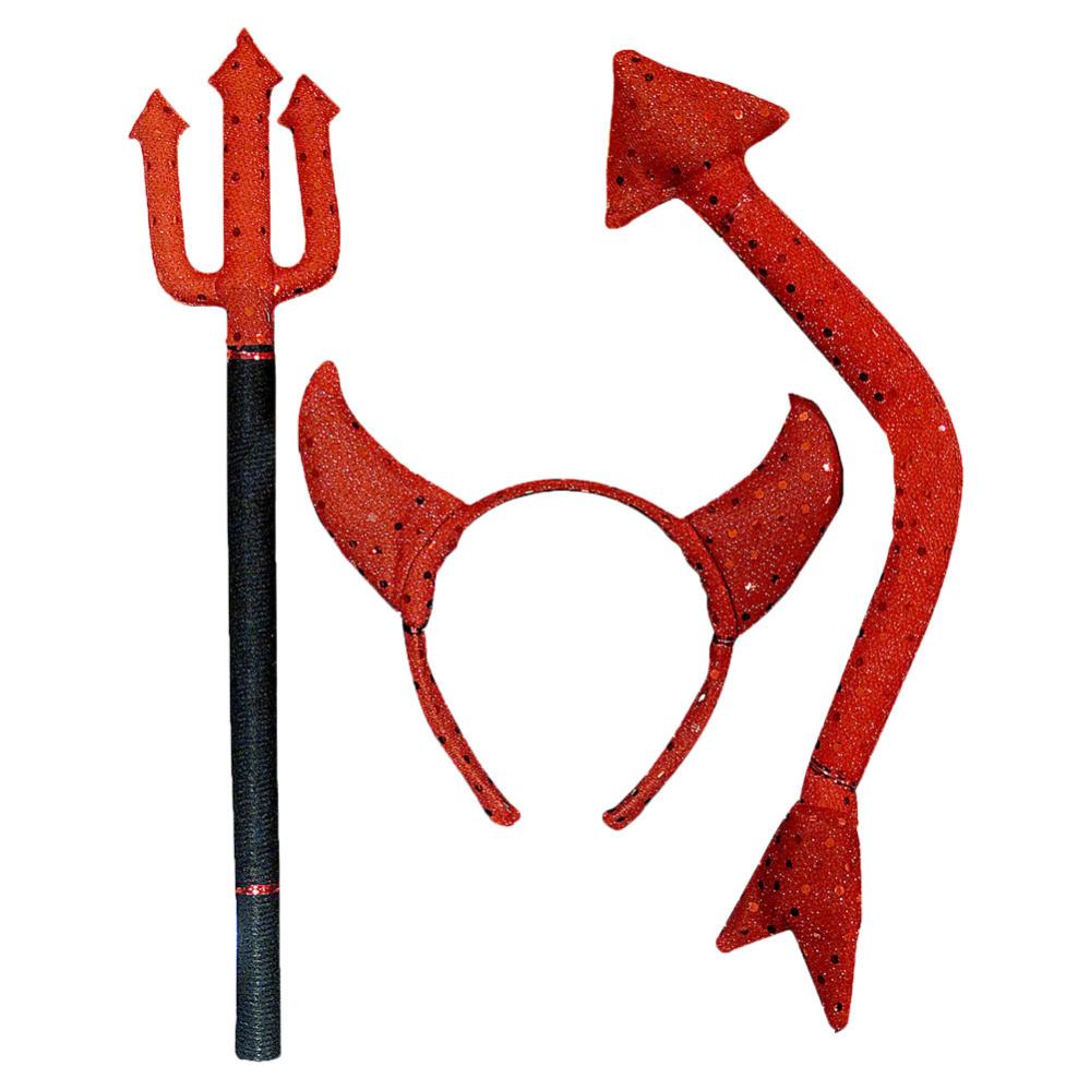 Ska du klä ut dig till djävul till halloween eller maskerad så är detta paljetterade djävulsset ett måste! Ett glittrigt set med djävulshorn på diadem, en djävulssvans och en djävulsgaffel som blir perfekta tillbehör till din djävul utklädnad. Utmärkta tillbehör till exempelvis en snygg djävulsklänning.