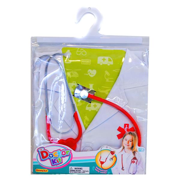 Förvandlas till doktor på bara ett ögonblick med detta doktorset för barn! Roligt set med en vit doktorsrock och ett rött leksaksstetoskop som får dig att se precis ut som en riktig doktor. Passande doktorsleksaker för dig som är ute efter en fin doktor utklädnad till lek och maskerad.