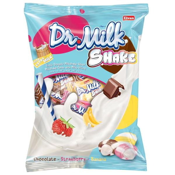 Dr Milk Shake omfattar en stor påse med milkshakesmakande godis med smak av jordgubb, choklad och banan.