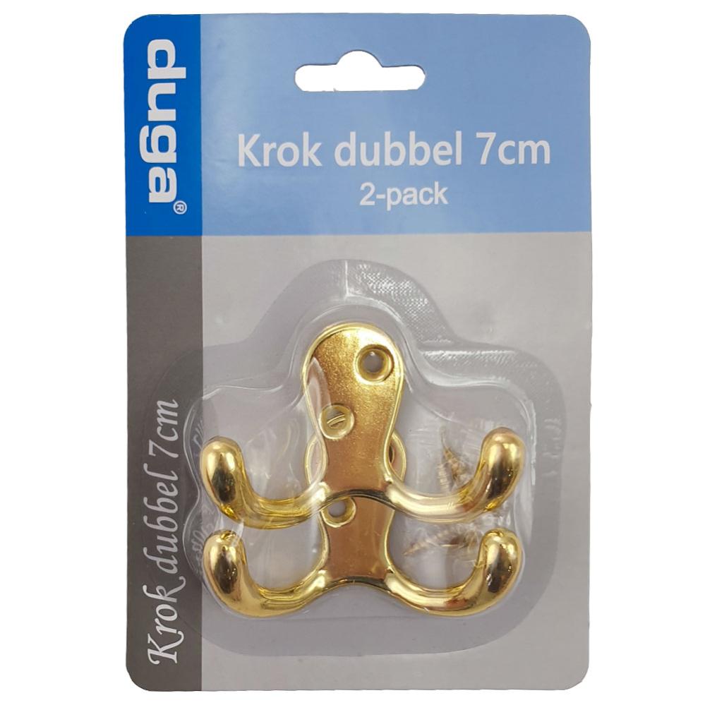 Dubbelkrokar Guld omfattar 2 stycken guldiga dubbelkrokar av metall som är ca 4 cm höga och 7 cm breda. Guldiga skruvar för uppsättning medföljer.