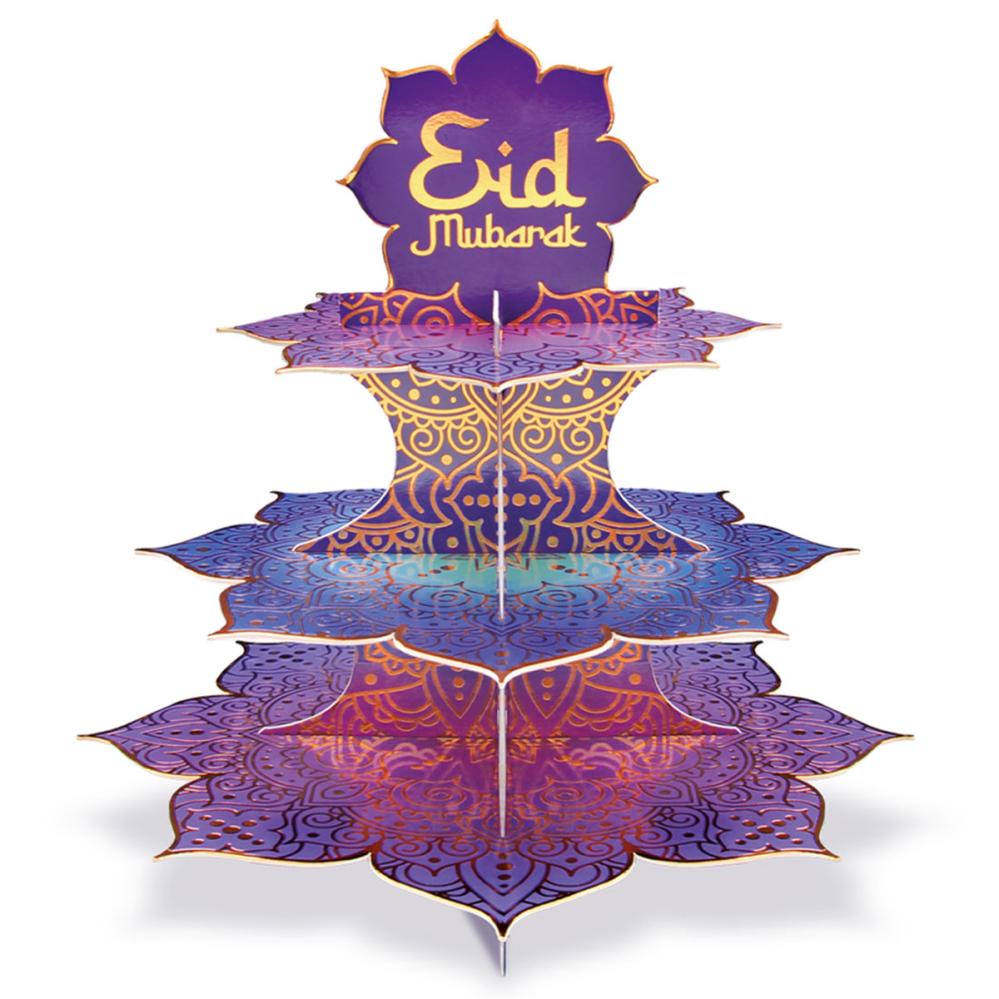 Skapa en festlig dukning med detta Eid Mubarak cupcakeställ i tre våningar, perfekt som dukningstillbehör för cupcakes och godsaker. Ett färgglatt tillbehör som garanterat väcker uppmärksamhet på nästa fest med Eid Mubarak-tema.