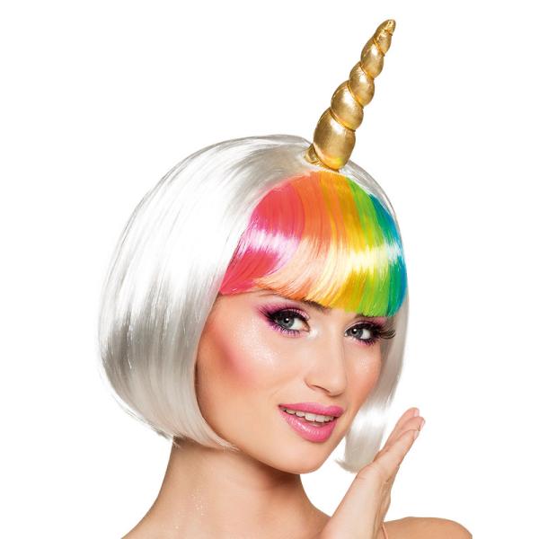 Enhörnings Peruk med Enhörningshorn omfattar en kort peruk med vitt hår, regnbågslugg och ett guldigt enhörningshorn i tyg.