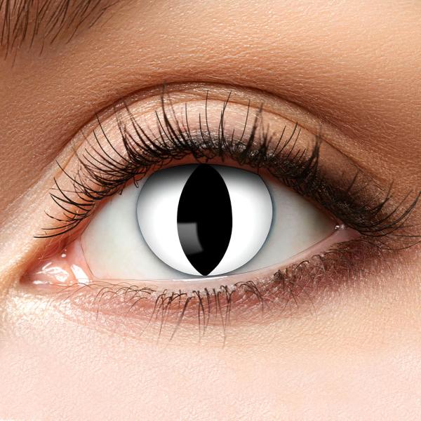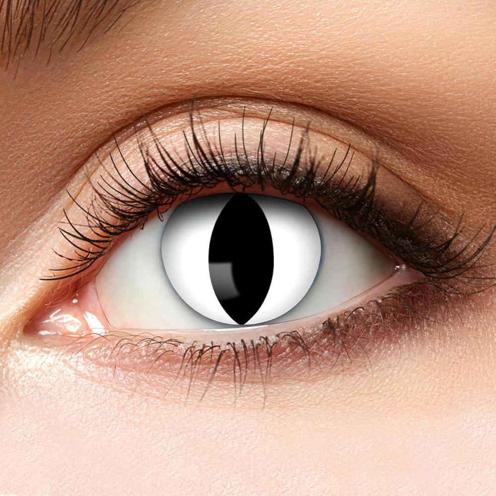Färgade linser höjer snabbt och enkelt hela din halloween utklädnad samtidigt som de får dig att se riktigt häftig ut. Just dessa halloweenlinser kommer i vitt med smala, svarta kattpupiller, vilket passar lika bra till en söt kattdräkt som till en läskig häxutklädnad. Helt enkelt perfekta crazy linser för flera olika utstyrslar!