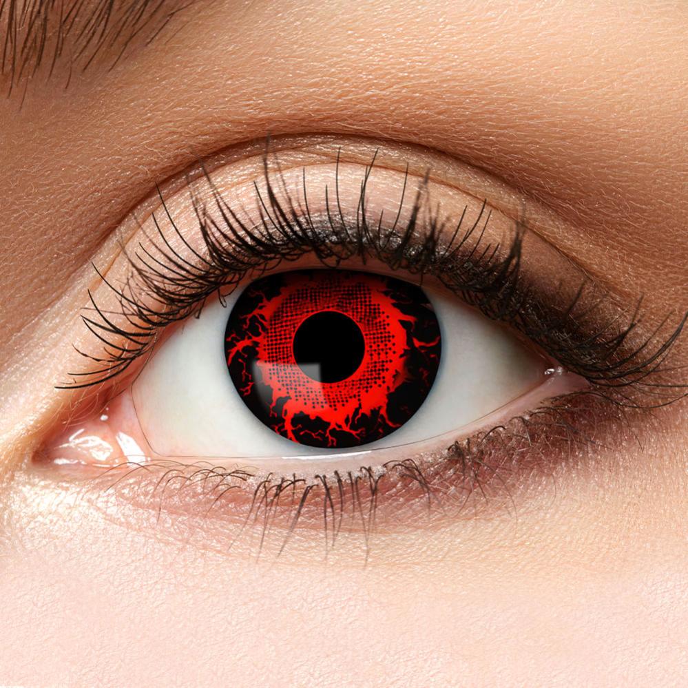 Färgade Crazy Linser Cataclysm omfattar ett par röda och svarta 3-månaders crazy linser för vuxna.