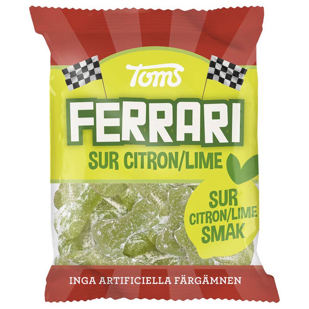 Ferrari Sura Vingummin 120g omfattar en påse med 30 sura vingummin med citronsmak i form av gröna Ferrari-bilar.