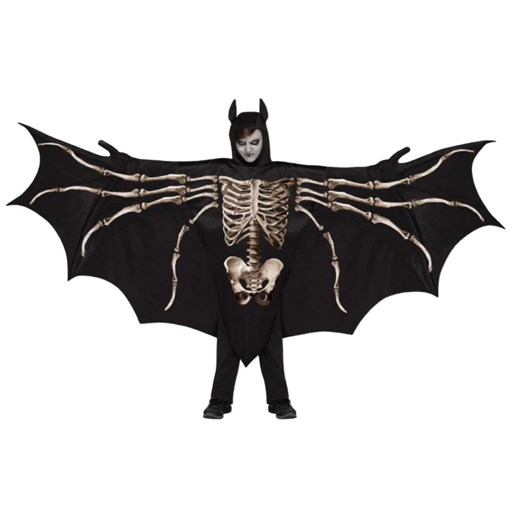 Fladdermus Tunika med Huva & Vingar Barn omfattar en svart tunika med huva, stora hopfällbara fladdermusvingar samt ett realistiskt tryck av skelettben. Dräkten har även öppningar för händerna för ökad rörlighet.