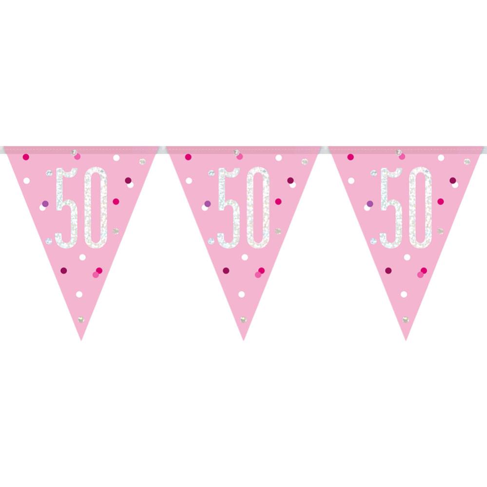 Fira 50 års fest och kalas med buller och bång och kanske en festlig flaggirlang i rosa med holografisk silver effekt! Superfin 50 års girlang med snygga vimplar och flaggor som blir en läcker dekoration, ett måste för ett extra tjusigt 50 års firande.