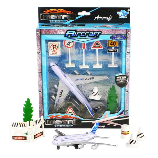 Flygplan Leksak Set omfattar ett leksaksset med ett flygplan och små tillbehör. Leksakerna är tillverkade av plast och metall.