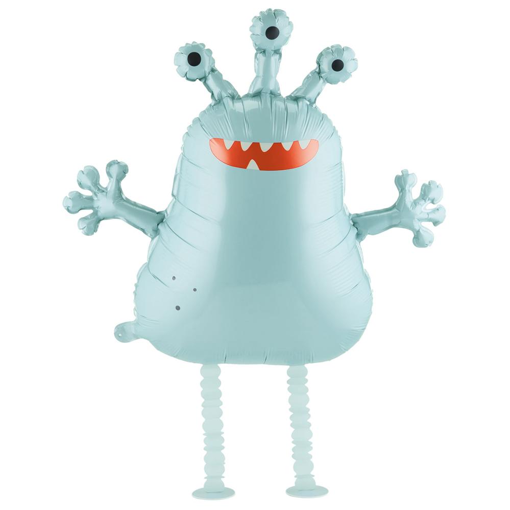 Folieballong Alien Airwalker 58 x 60 cm omfattar en folieballong i form av en dimblå alienfigur med små fötter och långa ben som skapar en gående effekt när den fylls med helium. Ballongen kan även fyllas med luft och levereras med ett sugrör för uppblåsning.