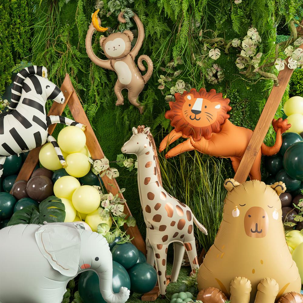 På ett kalas med djungeltema blir en ballong med apa snabbt kvällens skojare, och denna folieballong passar fint när djur är kalasets tema, särskilt om en djurballong redan väntar vid bordet. Den stjäl gärna några skratt innan tårtan ens hunnit fram.