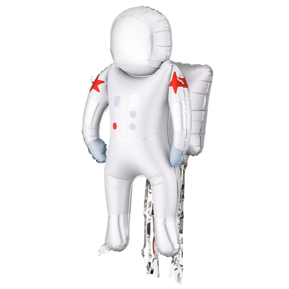 Folieballong Astronaut 45 x 81 cm är en ballong i form av en astronaut i vit rymddräkt med en röd stjärna runt båda överarmarna. Astronauten har ett vitt paket på ryggen med silverfärgade folieslingor som hänger ned. Ballongen fylls med luft via det medföljande blåsröret.