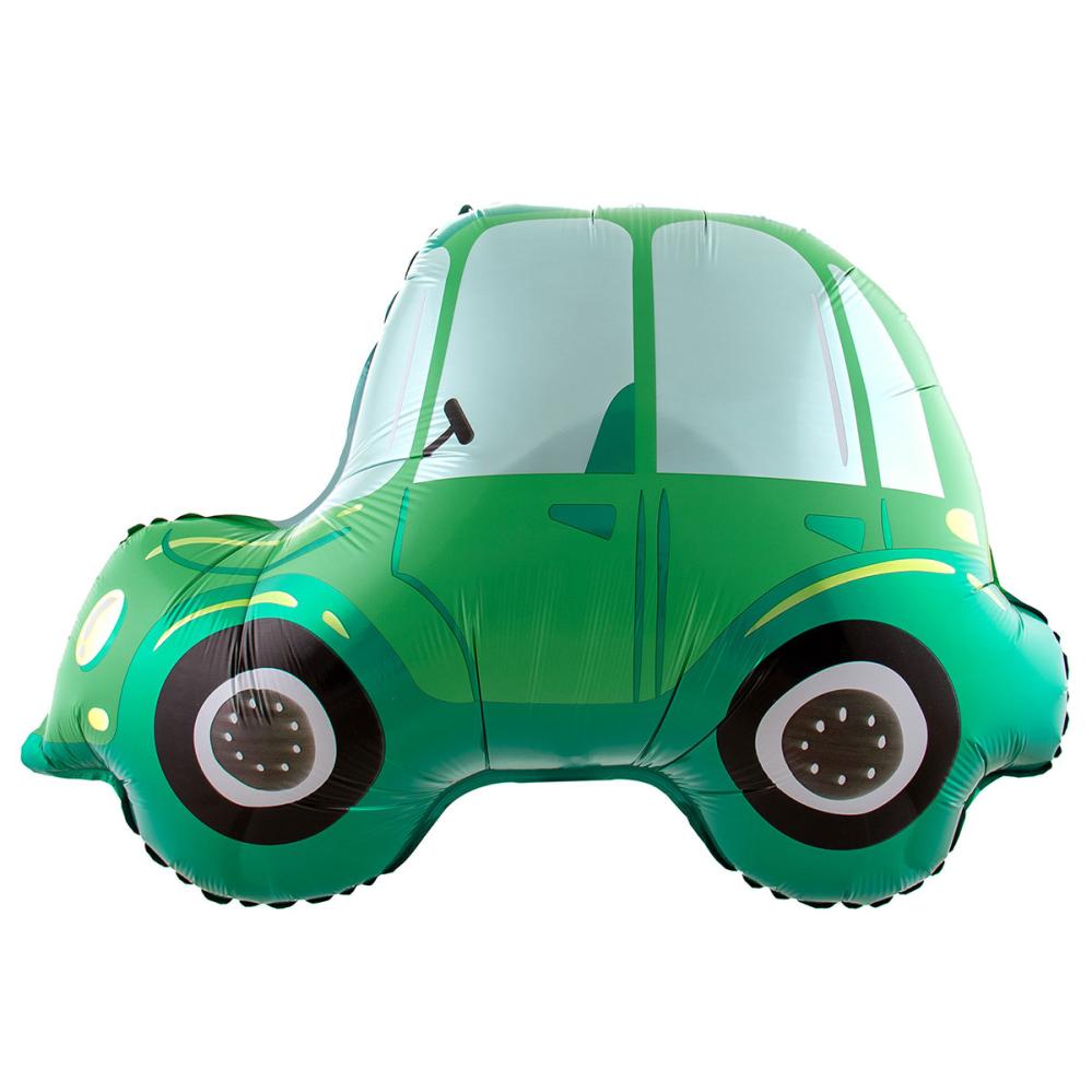 Folieballong Bil Grön 68 x 45 cm omfattar en folieballong i form av en grön bil. Bilen har ljusa fönster och svarta däck.