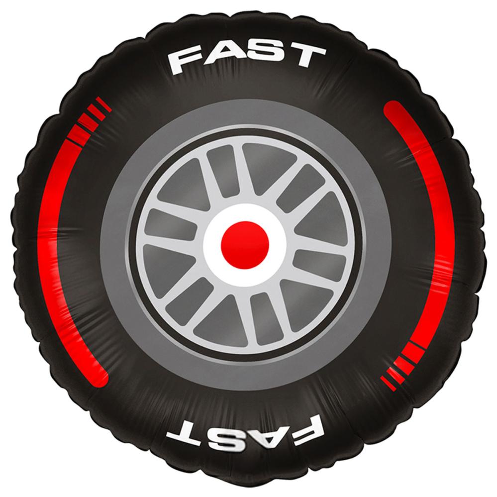 Folieballong Bildäck Racing 35 cm är en rund, svart folieballong med ett racinginspirerat däckmotiv, detaljer i rött, grått och vitt samt texten 'FAST' upptill och nedtill.