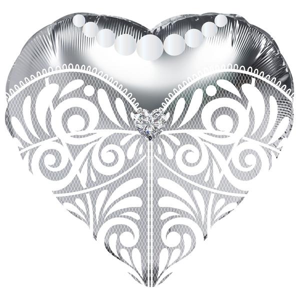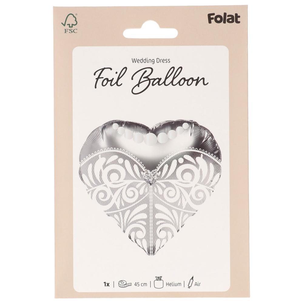 Folieballong Bröllopsklänning Silver 45 cm är en folieballong i form av en bröllopsklänning i silver. Ballongen är hjärtformad med ett vitt halsband. Ballongen går att fylla med luft eller helium.