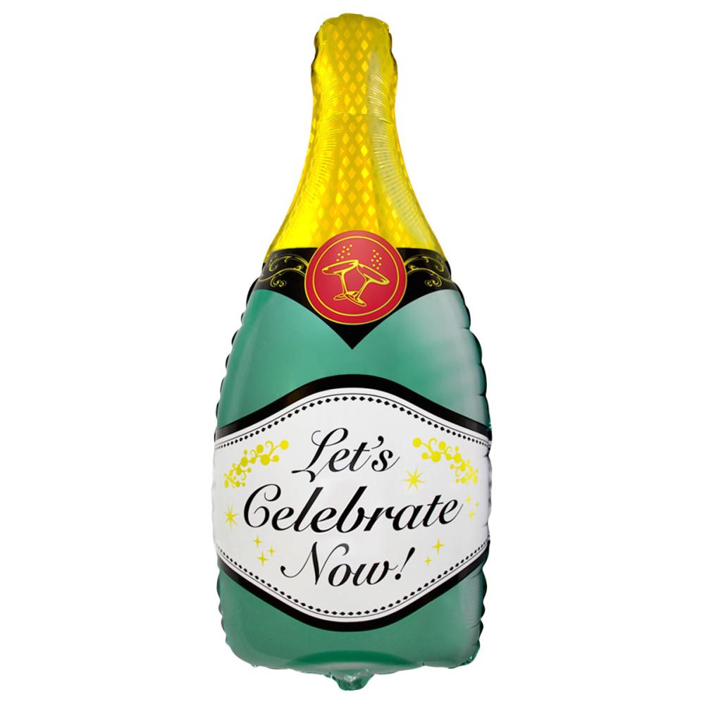 Folieballong Champagneflaska Let's Celebrate Now 83 cm omfattar en folieballong formad som en grön champagneflaska. Flaskan har motiv av en guldig topp, detaljer i rött och svart samt en vit etikett med texten "Let's Celebrate Now!".