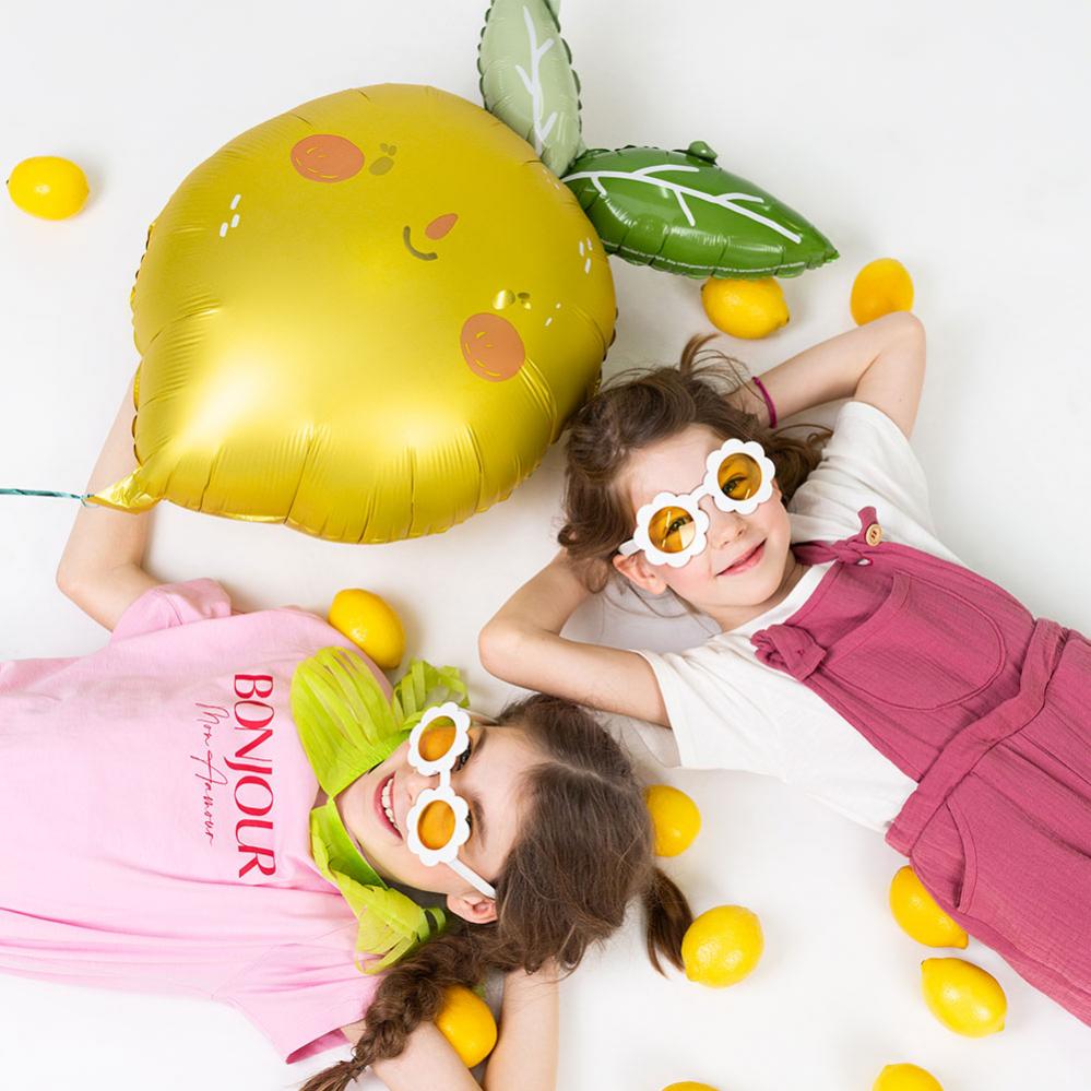 Folieballong Citron är en folieballong i form av en gul citron med gröna löv och ett leende ansikte med rosiga kinder.