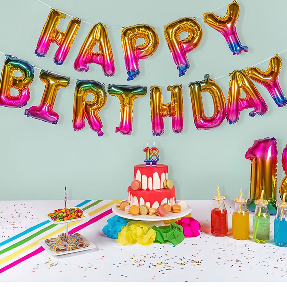 Folieballong Girlang Happy Birthday omfattar en girlang i guld och regnbågsfärger med 13 stycken bokstavsballonger i form av texten "Happy Birthday". Ballongerna är i folie och fylls med luft med hjälp av medföljande sugrör. Girlangen är ca 8 meter lång och bokstäverna är ca 30 cm höga.