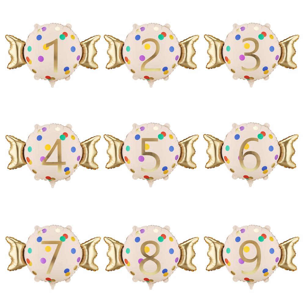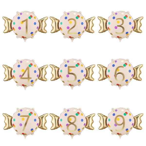 Folieballong Godiskaramell med Siffra består av en kräm- och guldfärgad folieballong i form av en godiskaramell, dekorerad med färgglada prickar och en siffra i guldfärg. Kan fyllas med luft eller helium och levereras med ett sugrör för uppblåsning.
