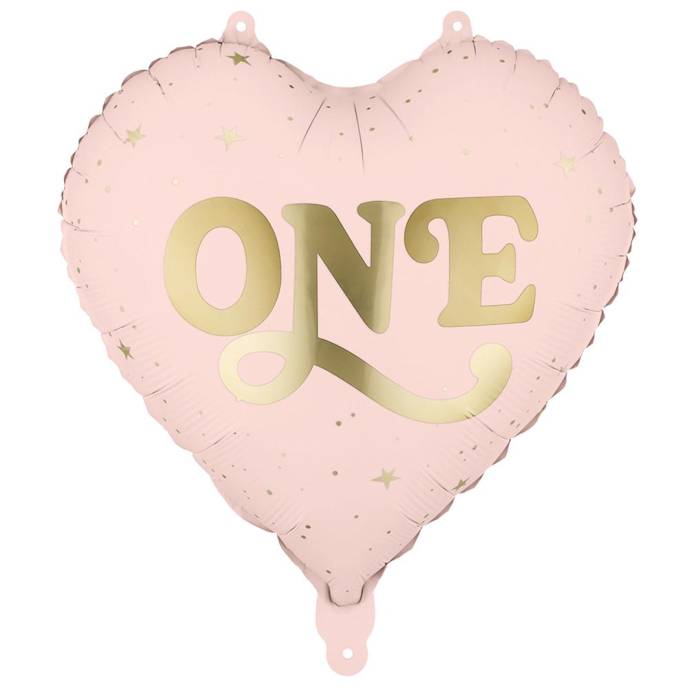 Folieballong Hjärta One Ljusrosa omfattar en ljusrosa, hjärtformad ballong med ordet 'ONE' i elegant guldfärg i mitten, omgiven av små prickar och stjärnor längs ballongens kant i en glänsande guldfinish. Den kan fyllas med luft eller helium och levereras med ett sugrör för uppblåsning.