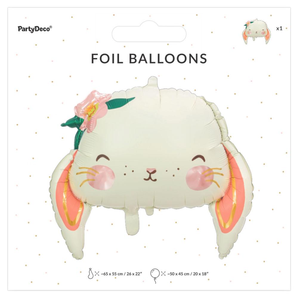 Folieballong Kanin omfattar en ballong i folie som ser ut som en glad kanin i vitt med hängande öron och detaljer i rosa och guld. Ballongen fylls med helium eller luft, är ca 50 x 45 cm stor och har självförslutande ventil.