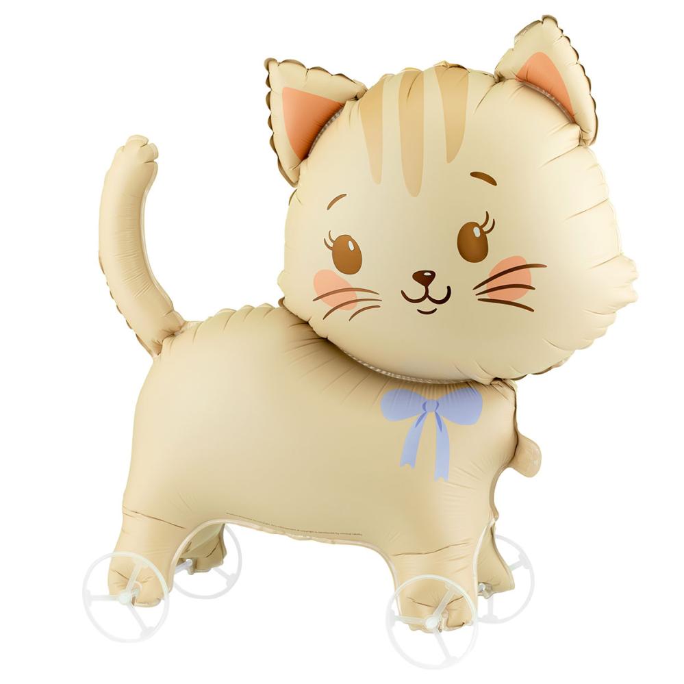 Folieballong Katt på Hjul 61 x 65 cm omfattar en ljusbeige folieballong i form av en söt kattunge. Ballongen är utformad för att stå på marken när den är uppblåst och kan flyttas runt tack vare de medföljande hjulen och snöret. Fylls endast med luft och kan enkelt blåsas upp med det medföljande sugröret eller med en ballongpump för snabbare uppblåsning.
