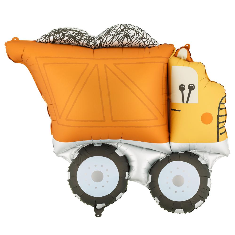 Folieballong Lastbil 87 x 69 cm är en ballong i form av en gul lastbil med orange last och svarta däck. Ballongen fylls med luft via det medföljande blåsröret eller med helium.