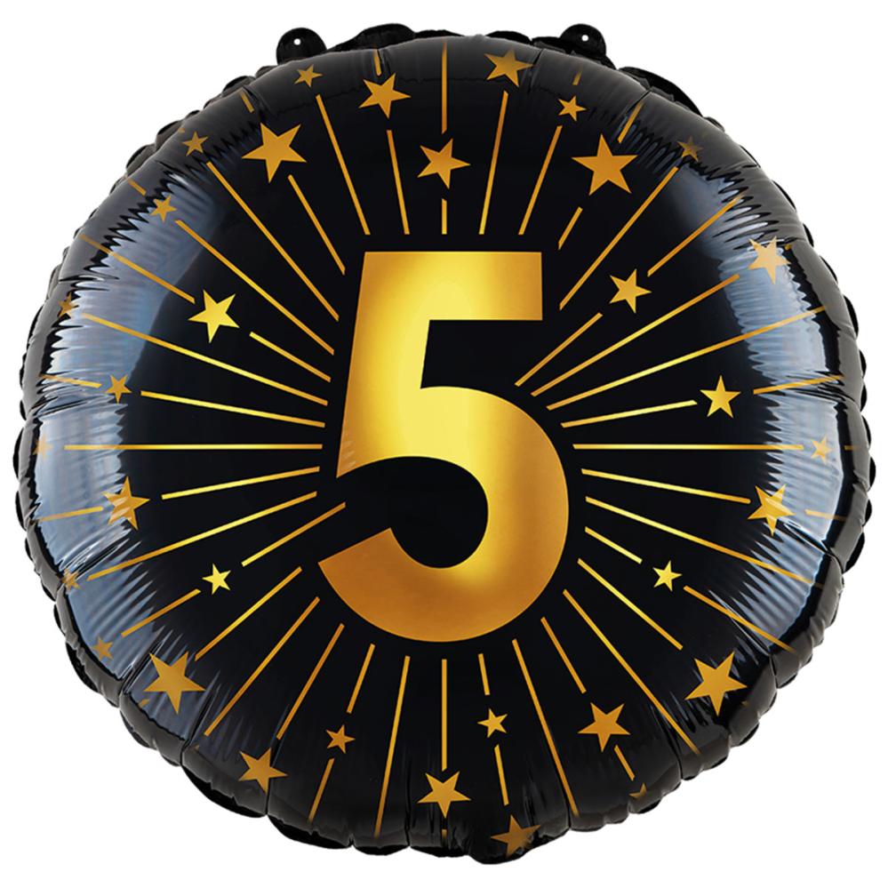 Folieballong med Stjärnor & Siffran 5 är en rund folieballong med strålande stjärnor och siffran "5" i guld mot svart bakgrund.